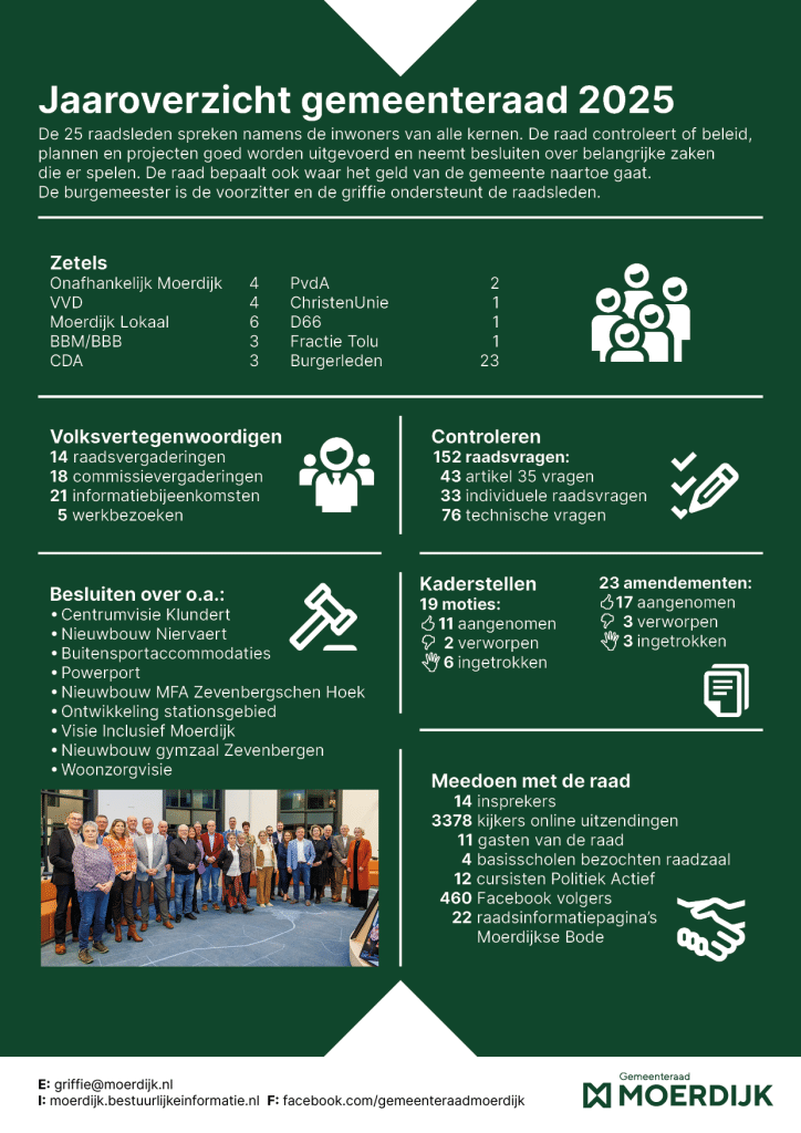 De gemeenteraad bepaalt het beleid en neemt de belangrijkste beslissingen in de gemeente. Daarnaast stelt de raad de verordeningen vast. De raad stelt vast welke doelstellingen moeten worden gehaald. Vervolgens controleert de raad of het college van burgemeester en wethouders, dat het dagelijkse bestuur vormt, deze doelstellingen ook daadwerkelijk haalt. De gemeenteraad van de gemeente Moerdijk bestaat uit 25 leden. Raadsleden en -fracties krijgen bij de uitvoering van hun taken (ambtelijke) ondersteuning van de raadsgriffier.