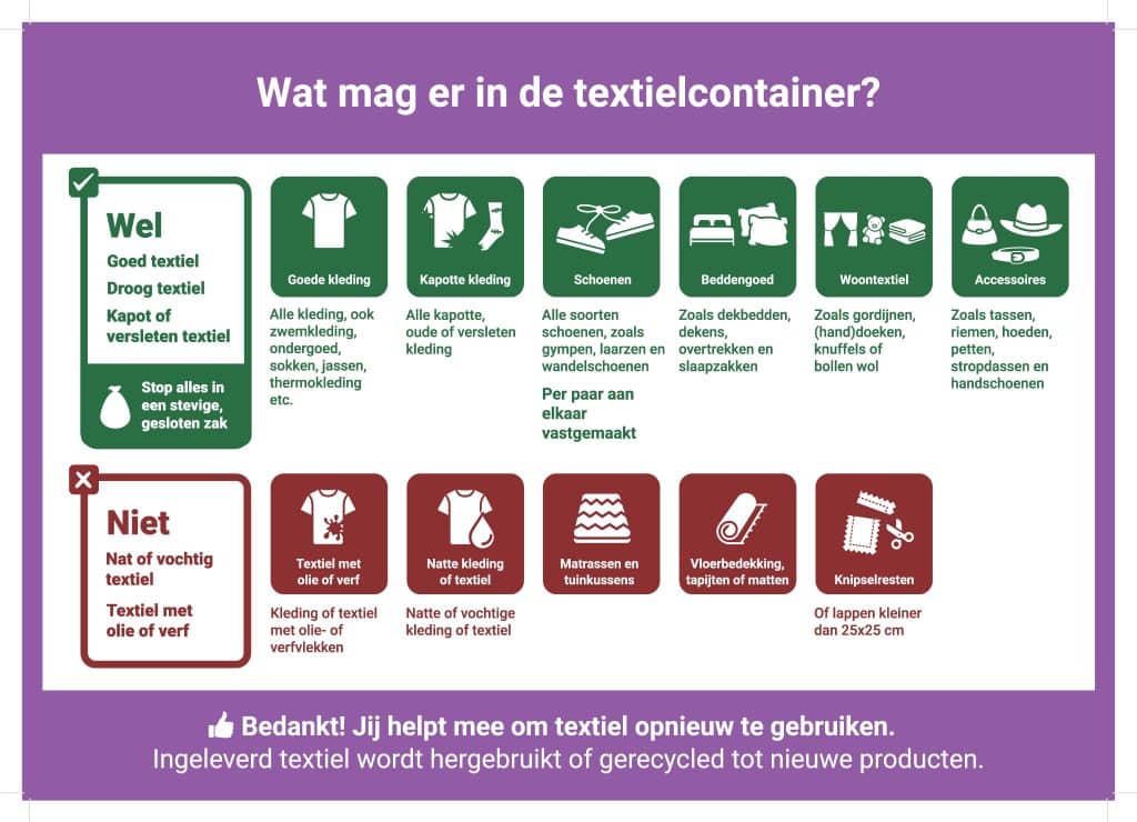 Van tijd tot tijd worden in ieder huishouden de kledingkasten uitgeruimd. Alles wat niet meer in de mode is, of wat u niet meer aantrekt, doet u weg. Kleding die u wegdoet, maar ook oude dekens en poetslappen, kunt u in een gesloten zak in de textielcontainer gooien.