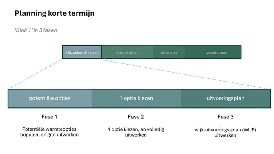 In de eerste drie fasen wordt gewerkt naar de keuze voor een warmtesysteem. Dit systeem wordt vervolgens uitgewerkt in een uitvoeringsplan, zodat de voorbereiding en uitvoering kunnen starten. De keuze komt tot stand op basis van de wensen van inwoners én de eisen van gemeente Moerdijk en Woonkwartier voor een toekomstbestendig en betrouwbaar warmtesysteem.