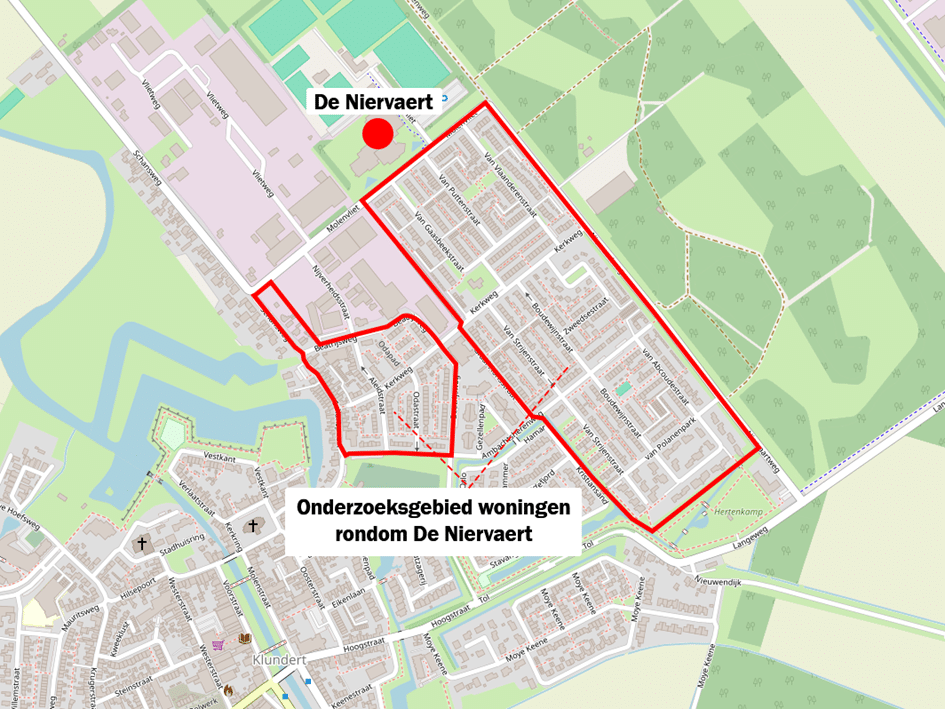 Op bovenstaande kaart is Klundert te zien. De Niervaert wordt aangewezen met een rode stip en er is een rood omlijnd gebied te zien van woningen die rondom de Niervaert liggen. Deze liggen ten zuiden van de Niervaert.
