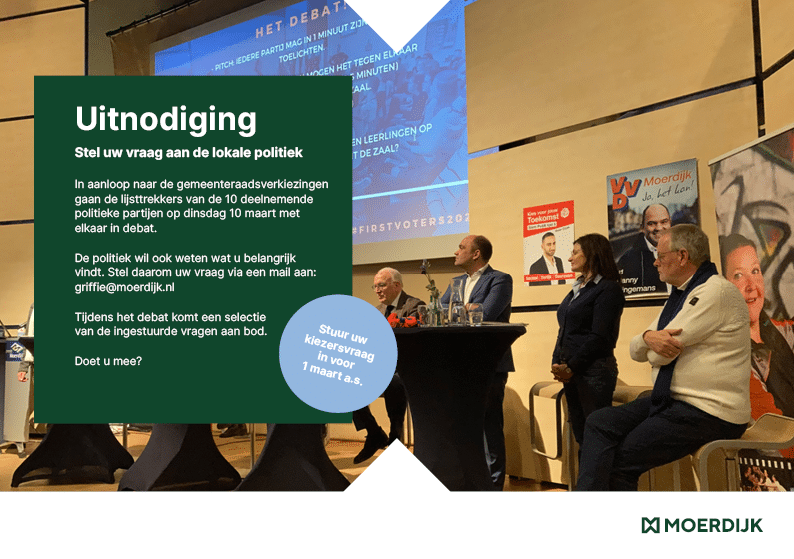 In aanloop naar de gemeenteraadsverkiezingen vindt op 10 maart het lijsttrekkersdebat plaats in de Moerdijkzaal van het gemeentehuis van 19.30 uur tot 21.30 uur. Tijdens dit debat gaan de lijsttrekkers van de deelnemende politieke partijen met elkaar in gesprek over actuele thema’s binnen onze gemeente.