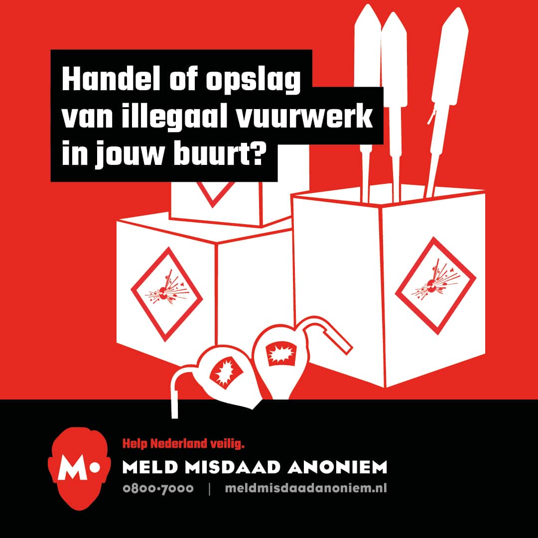 Voor de aanpak van de handel, opslag en transport van illegaal vuurwerk zijn meldingen cruciaal. Meld bijvoorbeeld verkoop- of opslaglocaties van illegaal vuurwerk. Of gegevens van handelaren, zoals een naam, adres, telefoonnummer, kenteken of verkooptijden. Dankzij anonieme tips worden jaarlijks tienduizenden kilo’s illegaal vuurwerk opgespoord. Help ook jouw buurt veilig! Meld anoniem via 0800-7000 of meldmisdaadanoniem.nl.